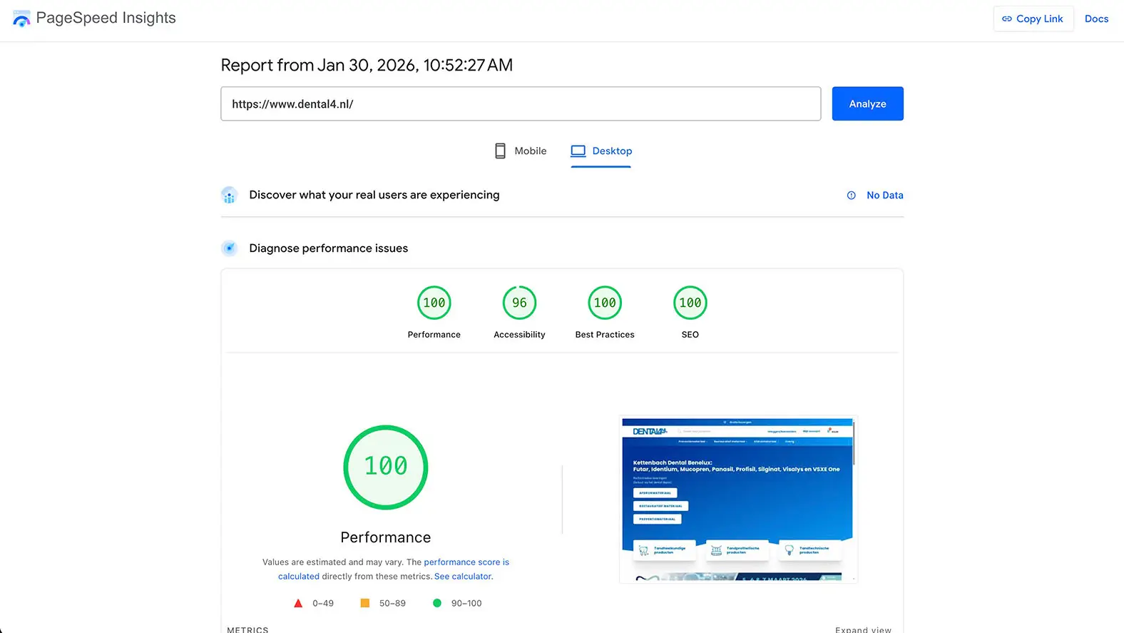 Na optimalisatie testen we uitgebreid op mobiel en desktop. Je ontvangt een duidelijk rapport met de behaalde cijfers en aanbevelingen voor toekomstig onderhoud. We streven naar een 100/100 score op PageSpeed.